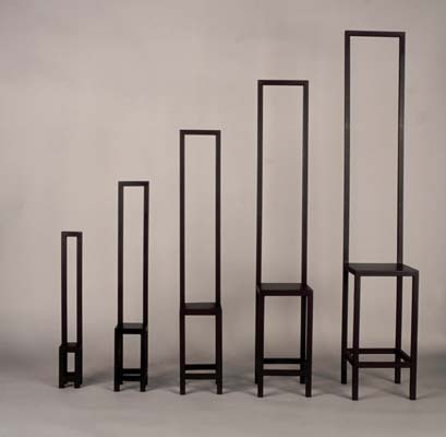 Serie van vijf stoelen in oplopende formaten.