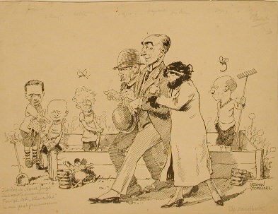 - BeschrijvingGeannoteerd langs bovenzijde "Jimmink v. Meerwijk v.d. Dries Veldhoven Burgemeester (?) mevr. Brouns Meyring Zie/omzijde". Geannoteerd linksonder: "Ziet hoe de "Vroede Jeugd"/ zich weet te amuseren/Terwijl dit "Klaverblad"/ In vree gaat promeneeren". Rechtsonder: "De Zandbak". Verso: Variaties op de tekst en aantekeningen van Moerkerk.
