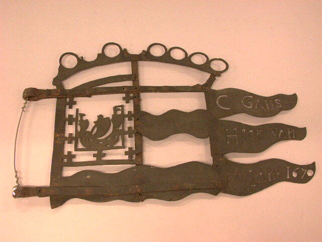 Windwijzer van het huis de Elzenbosch te Nuland. Opengewerkte zinken plaat in de vorm van het gekroonde wapen van de in 1682 door de koning van Engeland tot ridder (baronet) verheven Cornelis Gans, heer van Bommenede, Blois en Nuland, naar buiten uitlopend in drie wimpels waarin uitgesneden: C GANS/HEER VAN/NVLANT 1670. Het geheel is bevestigd aan een ijzeren raamwerk. Vgl. inv.nr. 8479: portret van zijn vader J. Gans.