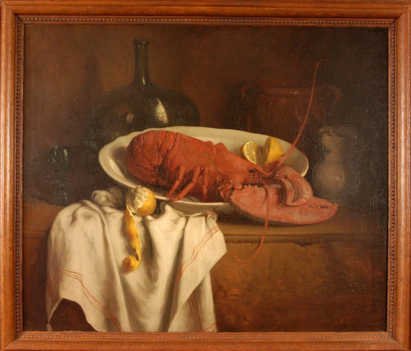 - BeschrijvingOp een tafel waar een witte theedoek op ligt, staat een schaal met daarop een gekookte kreeft en doorgesneden citroen.