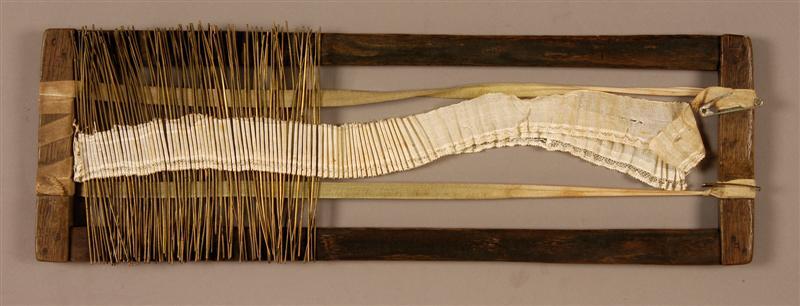 Hardhouten rekje voor het plooien van kanten stroken. Bespannen met wit katoenen keperband. Keperband vastgezet met 2 sluitspelden. Met ca 150 bijbehorende koperen rietjes en een katoenen voorstrook, die bestaat uit 2 stroken witte katoen de bovenste strook is fijner geweven dan de onderste, elk afgezet met een smal wit katoenen bandje.