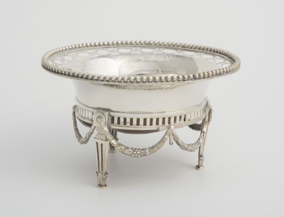 - BeschrijvingZilveren rond pijpcomfoor in Lodewijk XVI-stijl boven- en onderrand ajour langs bovenzijde een parelrand bak staat op 3 gecanelleerde, taps toelopende poten, die zijn verbonden door steeds in het midden met een lint even opgenomen guirlandes van druivenranken. Met rood koperen binnenbak.