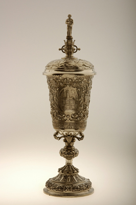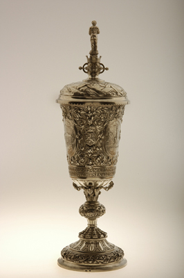Ronde oplopende voet met lofwerk, ovalen en voluten. Nodus met afwisselend vrouwen- en leeuwenkoppen. Aan onderzijde cuppa drie voluten met mascarons. Op cuppa bladwerk en drie cartouchevormige medaillons met voorstellingen van de Bossche Drakenfontein, het Bossche stadhuis en de Vughterpoort. Hiertussen de wapens van de provincie Noord-Brabant, de familie Van der Does de Willebois en de stad 's-Hertogenbosch. Langs onderzijde cuppa, band met opschrift: "P.J.J.S.M. V/D DOES DE WILLEBOIS, EQUITL. BURGL-MAGISTRO BUSCODUC.*/SENATUS OPPIDI D.D. MCMIX.JUBILEUM AGENTL ARGENTEUM". Op de deksel voorstelling van twee riviergoden, met bijschriften: "DOMMEL FL" en "AA.FL". De deksel bekroond door kroon van kantelen waarop een wildeman met knots. Aangeboden aan burgemeester P.J.J.S.M. van der Does de Willebois t.g.v. zijn zilveren ambtsjubileum in 1909 door de gemeenteraad.