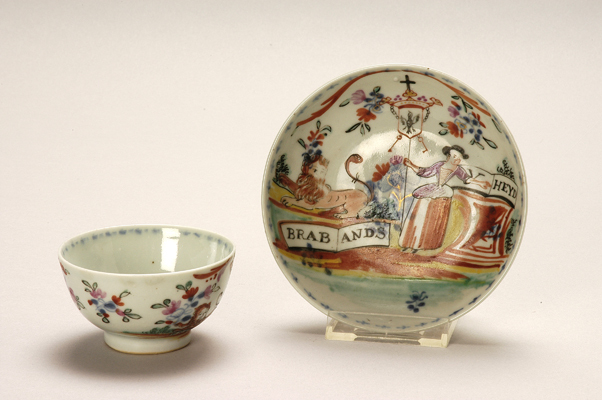 Chinees wit porseleinen kommetje met bijbehorende onderschotel, met bloemdecoratie in blauw onderglazuur (zgn. Amsterdams Bont). Het porselein is in de Noordelijke of in de Zuidelijke Nederlanden overgeschilderd (bovenglazuur) met een veelkleurige voorstelling die betrekking heeft op de politieke gebeurtenissen in de jaren 1787-1790. De op de kop en schotels afgebeelde vrijheidsmaagd, zinnebeeld van vrijheid en van de onafhankelijke staat, alsmede de opschriften 'BRABANDS VRYHEID' en 'BRABANDS V HEYD' verwijzen naar de zgn. Brabantse omwenteling de leeuw, hier gaand, maar omziend weergegeven, is het symbool van kracht en tevens het Brabantse wapendier. Het aan de bovenzijde van de voorstelling afgebeelde gekroonde wapen, is dat van de vrijheid Arendonk nabij Turnhout, eveneens gelegen in de Kempen, waar de eerste successen van de Brabantse patriotten werden behaald. Het kruis boven de kroon duidt vermoedelijk op een verband met de conservatief-clericale partij der Statisten.