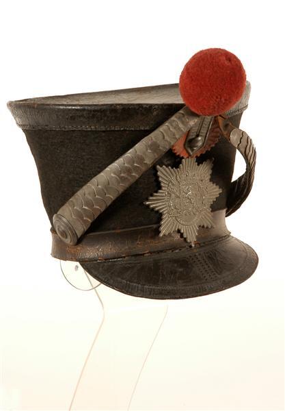 Model 1828, voor schutter. Sjako van zwart vilt. Bodem van zwart leer met omgeslagen rand. Midden op de bodem een ingeperst bolletje. Zwart leren band langs de onderrand van de sjako. Franse klep van zwart leer. Oranje leren kokarde. Metalen lis met gladde, gebombeerde metalen knoop. Metalen sjakoplaat met het koninklijk wapen omgeven door stralen. Zweetband van in punten gesneden zwart, geprent leer. Punten omgenaaid. Keelbanden van zwart leer met een metalen gesp. Beide banden zijn versierd met metalen plaatjes en aan de sjako bevestigd met een metalen rozet. Met de hand genaaid.