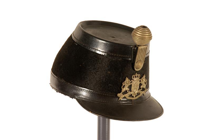 Model 5 aug. 1868, voor onderofficier. Sjako van zwart kastoor. Het kastoor is aangebracht op enkele lagen gesteven katoen. Verdiepte bodem van zwart leer met omgeslagen rand en ingeperst bolletje. Langs de onderrand een schuingesneden zwarte leren band. Leren klep, bovenzijde zwart, onderzijde groen. Klep afgebiesd met een zwart leren bandje. Voering van paars papier, beplakt met paarse zijde. Zwarte leren stormband met zwarte metalen gesp, aan de binnenzijde van de sjako bevestigd aan zwarte metalen haken. Metalen lis met gladde gebombeerde metalen knoop en ronde metalen bal met gat. In de bal is een pluim van zwarte haneveren (inv.nr. 11747.245) gestoken.