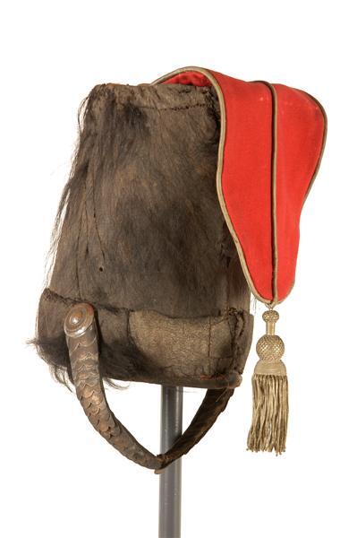 Model 17 okt. 1828, voor tamboer-majoor. Kolbak met zak en pluim (inv.nr. 11747.242). De opstaande kant van de kolbak is samengesteld uit verschillende fragmenten van de pels van de zwarte beer. Bodem van zwart gelakt leer. Dubbele zweetband van zwart geprent leer, in punten gesneden. De punten zijn omgeslagen en vastgenaaid. Door de hierdoor ontstane lussen is een zwarte veter gehaald. Tussen de onderrand van de kolbak en de zweetband is een reep grijs karton genaaid. Voering opstaande kant bruin leer. Voering van de bodem zwart leer. In de opstaande kant, aan beide zijden, een ingeperst gaatje. Keelbanden van zwart fluweel, versierd met verzilverde koperen plaatjes. Beide banden zijn aan de kolbak bevestigd met een metalen rozet. Boven aan de linkerzijde een metalen haak. Daarachter, op de naad van de bodem, een metalen ring. Boven aan de rechterzijde een genaaid trensje. Zak van rood laken, afgezet met zilverkoord. De bovenzijde is genaaid op een rond stuk zwart leer en met een metalen oog aan de bodem bevestigd. Aan de punt van de zak is een kwast van zilverkoord bevestigd. De kolbak is door A.J.J. van de Well ten onrechte "beremuts" genoemd (opmerking van dhr. F.J.H.Th. Smits, dd 16-6-1983).
