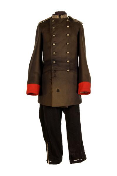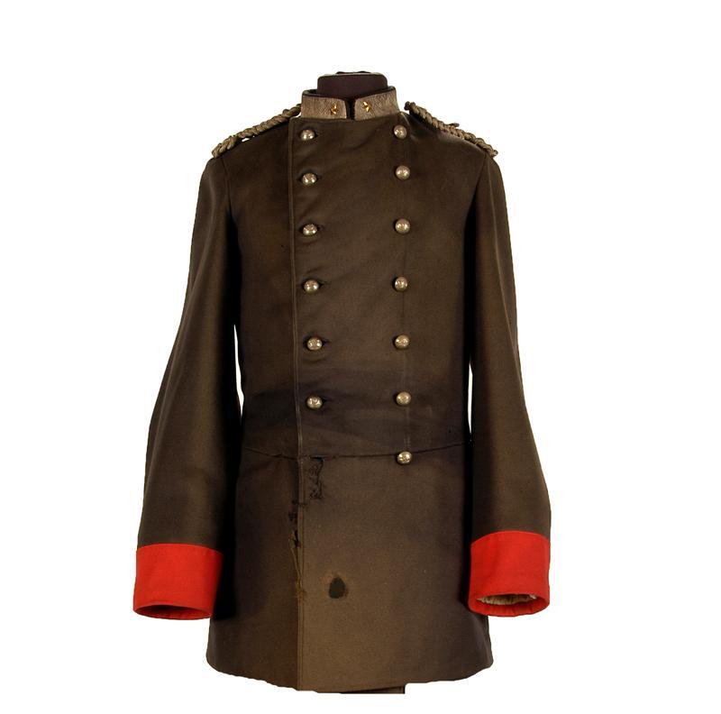 Model 11 maart 1869, voor majoor. Uniformjas van donkerblauw laken. Kraag en mouwopslagen van rood laken. Zilverband met zigzagmotief op de kraag genaaid. Links en rechts op kraag een koperen ster. Sluiting met 2 rijen van 7 metalen knopen met stedekroon en 7 knoopsgaten. Op beide mouwen 2 knopen (model als boven, maar kleiner). Op beide schouders een reepje zwarte stof, waarop een passant van gevlochten zilverkoord, inv.nr. 11747.090. Split afgezet met wit laken. Aan beide zijden van het split 3 knopen (als op voorpand). Binnenkant: voering zwarte satinet, gehele voeringlijf gepiqueerd in rood. Langs het beleg van beide voorpanden een randje katoenen satijn, paars met rode streepjes in het beleg een steekzakje. Rechts 6 en links 7 tegenknoopjes op beleg. Aan beide zijden van het split 2 tegenknoopjes (voor onderste 2 knopen. Aan iedere zijde van het split een binnenzak. Zak links onder taille. Lusjes in armsgatnaad: rechts wit met blauwe streepjes, links rose. Op kraag 1 metalen haak en oog, een bandje en een slipdasje. Voering mouwen: witte keperkatoen bedrukt met klein grijs/rood motiefje. Was aangehecht: 1 paar handschoenen, inv.nr. 11747.080. Handschoenen van jas verwijderd dd 15-6-1982. Behorend bij fouragère inv.nr. 11747.109 en pantalon inv.nr. 11747.069.
