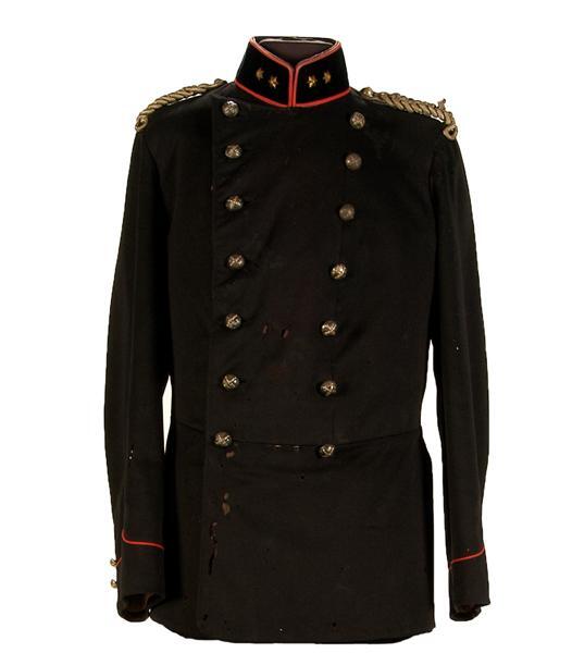 Model 4 april 1868, voor eerste luitenant der artillerie. Uniformjas van zwart laken. Kraag donkerblauw fluweel, afgezet met rood laken. Links en rechts op kraag 2 koperen sterren. Mouwopslagen met punt naar boven, rood gebiesd. Zwart laken afgezet met biesjes van rood laken. Sluiting met 2 rijen van 7 gebombeerde metalen knopen met gekruiste kanonnen en 7 knoopsgaten. Op beide mouwen 2 knopen (model als boven, maar kleiner). Op beide schouders passanten van gevlochten zilverkoord (inv.nr. 11747.094), aan een zijde opgenaaid, aan de andere zijde bevestigd met een knoop, als op mouw. Split afgezet met rood laken. Boven aan split 2 metalen knopen, als op voorpand. Binnenkant: voering zwarte satinet, gedeelte achter- en voorpand gepiqueerd (zwart). Beleg van beide voorpanden zwart, gekarteld, met daaronder een randje van rood laken 7 tegenknoopjes met rood garen gestikt steekzakje. Boven taillenaad wit katoenen visgraatband met goudkleurige effektstrepen. Links en rechts onder taillenaad voeringzak. Voering mouwen: witte katoenen satijn met groene strepen. Op kraag 2 metalen haken en ogen, een slipdasje en een lus van zwart laken. Behorend bij passanten, inv.nr. 11747.094 en pantalon inv.nr. 11747.073.