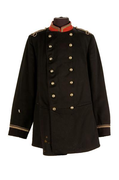 Model ca 1880, voor muzikant (onder-officier). Jas van donkerblauw laken met kraag van rood laken en schouderpassanten. Op de kraag en de mouwopslagen is zilvergalon genaaid. De kraag wordt gesloten met een haak en oog. De mouwopslagen zijn gebiesd met wit laken. Sluiting met 2 rijen van 7 metalen knopen (met stedekroon, groot model) en 7 knoopsgaten. Op iedere mouw 2 dito knopen, klein model. Split en kleppen op de achterkant afgezet met wit laken. Op iedere klep 3 metalen knopen als boven, groot model. Binnenkant jas: onder de kraag middenachter, een metalen kettinkje. Beleg voorpanden: donkerblauw laken, afgezet met wit laken. In beleg van beide panden een steekzakje. Voering van voor- en achterpand en beide steekzakjes donkergroene, glanzende keperkatoen. Voering van beide voorpanden en van een gedeelte van het rugpand gepiqueerd. Voering mouwen ecru katoenen satijn, bedrukt met fijn grijze streepjes. In de voering van de schoot, links voor, een zak van zwarte keperkatoen. 2 strookjes zwarte (grovere) keperkatoen langs de taillenaad. Op beide schouders een metalen knoop (met stedekroon, klein model) voor de bevestiging van de schouderpassanten, inv.nr. 11747.077. Behorend bij pantalon, inv.nr. 11747.103.