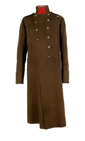 Model 1831. Donkergroene kapotjas. Geheel met de hand genaaid. De jas sluit middenvoor met 2 rijen van 6 metalen knopen met stedekroon en randversiering en 6 knoopsgaten. Kraag met patjes van rood laken. De kraag sluit met 3 metalen haken en ogen. Schouderlappen van dezelfde stof als de jas. Ze zijn in de mouwnaad genaaid en aan de andere zijde op de schouder bevestigd met een knoop (als boven) en een knoopsgat en 2 metalen haken en trensjes. De mouwen hebben omgeslagen mouwopslagen. Op taillehoogte zijn middenachter 2 banden aangebracht, om de taillewijdte te kunnen verstellen. Ze sluiten met een metalen knoop (als boven) en een knoopsgat. Aan weerszijden van deze banden een opgenaaide klep met 2 knopen (als boven). Onderaan achterpand een split in het midden. Voering van lijf, mouwen en kleppen: wit linnen. Op voering linker voorpand een witte linnen zak. De beide voorpanden van het lijf hebben een beleg van donkergroen laken. Kan gecombineerd worden met de inv.nrs. 11747.143, 141, 157 en 206a en 206b.