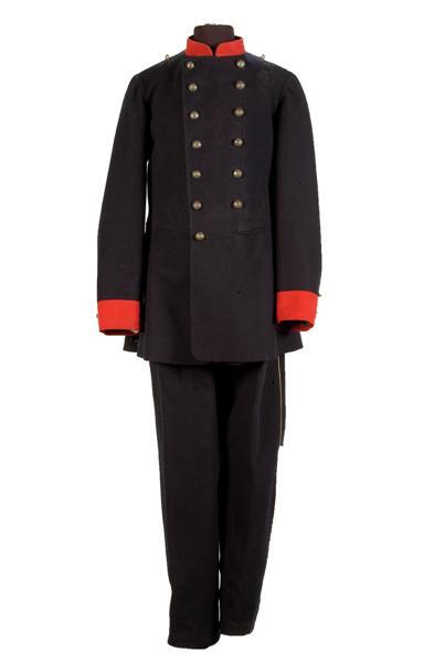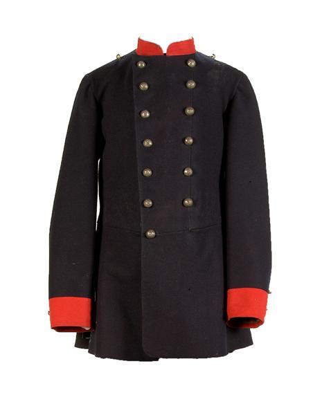 Mode 11 maart 1869, voor schutter. Uniformjas van donkerblauw laken. Kraag en mouwopslagen rood laken. Sluiting met 2 rijen van elk 7 gebombeerde, metalen knopen met stedekroon en 7 knoopsgaten. Op beide mouwen 2 knopen (model als boven, maar kleiner). Op beide schouders dito knoop. Split afgezet met wit laken. Aan beide zijden van de split 3 knopen, als op voorpand. In taillenaad links lus van donkerblauw laken, afgezet met wit laken, naar boven geslagen en bevestigd met (kleine) knoop en knoopsgat. Binnenkant: voering grijze katoen. Aan beide zijden van het split steekzakken van donkerblauwe keperkatoen. Op kraag 1 metalen haak en oog, lus van donkerblauw laken en slipdasje van zwarte katoenen satinet gevoerd met donkerblauw laken. Lus met tekst onder kraag. In beide schoudernaden een wit katoenen vetertje. Behoort bij inv.nr. 11747.072. Kan gecombineerd worden met de witte katoenen schouderpassanten inv.nr. 11747.101 a t/m c. Deze jas vervangt het onder cat.nr. 16 p 12 (v.d. Well) genoemde exemplaar.