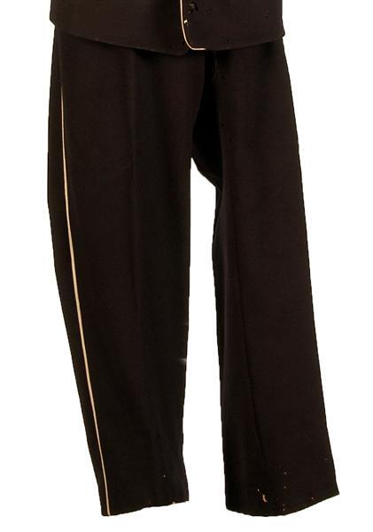 Model 30 april 1856, voor majoor. Pantalon van donkerblauw laken. Zijnaden met biezen van wit laken. In iedere zijnaad een steekzak. Middenvoor een blinde sluiting met 3 metalen knoopjes en 3 knoopsgaten. Bovenaan sluiting metalen haak en oog. Split in tailleband en gedeelte achternaad. Taillewijdte te verstellen met 2 bandjes van donkerblauw laken en metalen gesp op het achterpand. Voering sluiting donkerblauwe keperkatoen. Voering zakken van zware donkerblauwe keperkatoen. Voering tailleband en bovenste gedeelte achterpand grijze katoenen flanel. Versteviging in de zoom van de pijpen: jute, gebiesd met een strookje katoen.
