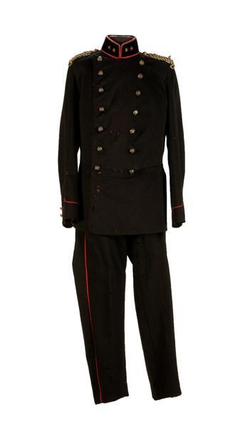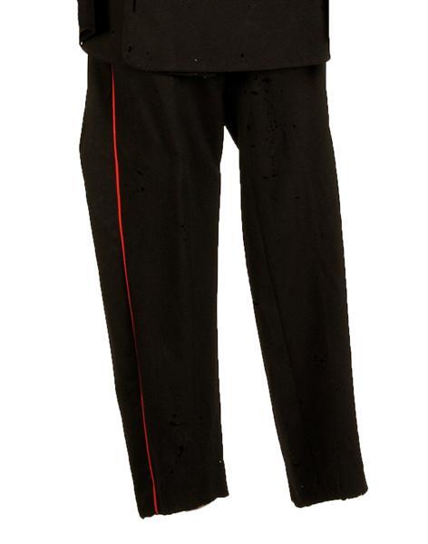 Model 4 april 1868, voor 1e luitenant der artillerie. Pantalon van zwart laken. Zijnaden met biezen van rood laken. In beide zijnaden steekzakken. Beide zakken hebben een blinde sluiting met een knoopje (zwart) en een knoopsgat. Middenvoor een blinde sluiting met 4 koperen knopen (klein) en 4 knoopsgaten. Bovenaan de sluiting een koperen haak en oog. Op rechtergedeelte sluiting 2 koperen oogjes voor bevestiging band. Op tailleband voor 4 en achter 2 koperen knopen (groot). Koperen knopen met opschrift J.W. DE JONG AMSTERDAM. Op rechter voorpand klein horizontaal steekzakje. Middenachter in tailleband en gedeelte van de naad een split. In het split is een zwart etiket genaaid met ingeweven versiering en tekst in oranjegeel: J.W. DE JONG AMSTERDAM. Taillewijdte te verstellen met bandjes van zwart laken en een koperen gesp op het achterpand. Voering voorsluiting en rechter steekzakje donkerblauwe keperkatoen. Zakken naturel katoen. Voering tailleband en bovenkant broek witte keperkatoen. Op de binnenkant van het linkervoorpand is een band van witte keperkatoen met 2 knoopsgaten bevestigd. In de zoom van beide pijpen is aan de voorkant een stukje naturelkleurig linnen, gebiesd met witte keperkatoen, genaaid. Op de zoom van beide pijpen is aan de achterkant een reepje donkerblauwe keperkatoen genaaid.