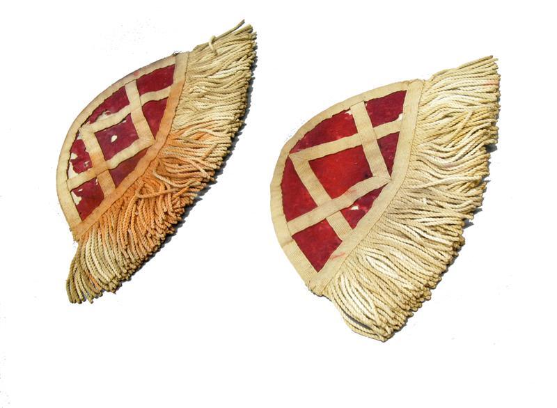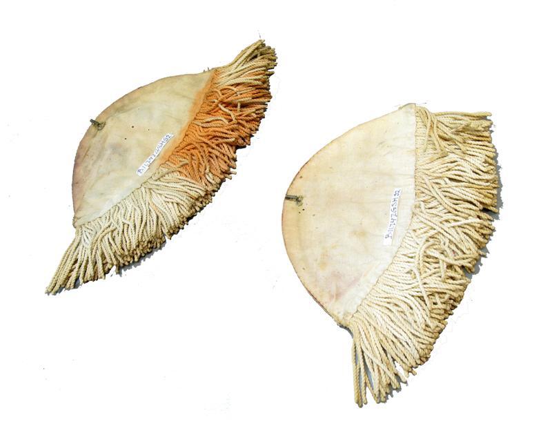 - BeschrijvingModel ..., voor tamboers in West-Indiƫ. Zwaluwnesten van rood laken, versierd met wit katoenen galon. Franje van wit katoenen koord. Voering van witte katoen. Op de achterzijde tegen de bovenrand een koperen haakje.