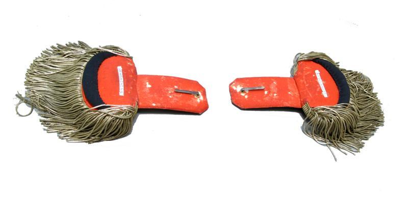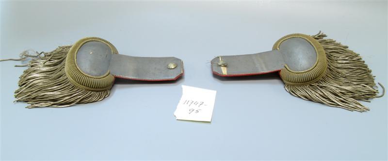 Model ..., voor kapitein. Epauletten zonder strepen in het zilverband met franje van zilverkleurige torsade. Omranding van gouddraad. Voering van rood laken. Kussentjes van donkerblauw laken. Op beide epauletten een gladde gebombeerde metalen knoop. Op de onderzijde van beide exemplaren een metalen beugel. Mogelijk zijn dit de epauletten vermeld onder cat.nr. 19. Epauletten behoren echter niet bij een uniform anno 1908. Dit zou een fout van v.d. Well kunnen zijn. Ze worden wel vermeld in het archief van de conservator van de verzameling dd 20 april 1909. 3 maart 1988 van jas inv.nr. 11747.053 verwijderd en apart opgeborgen.