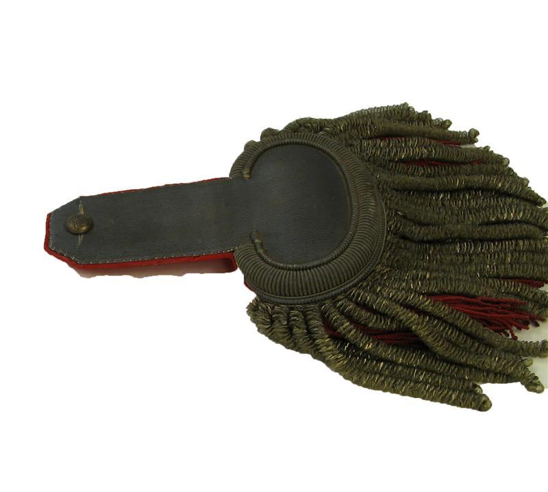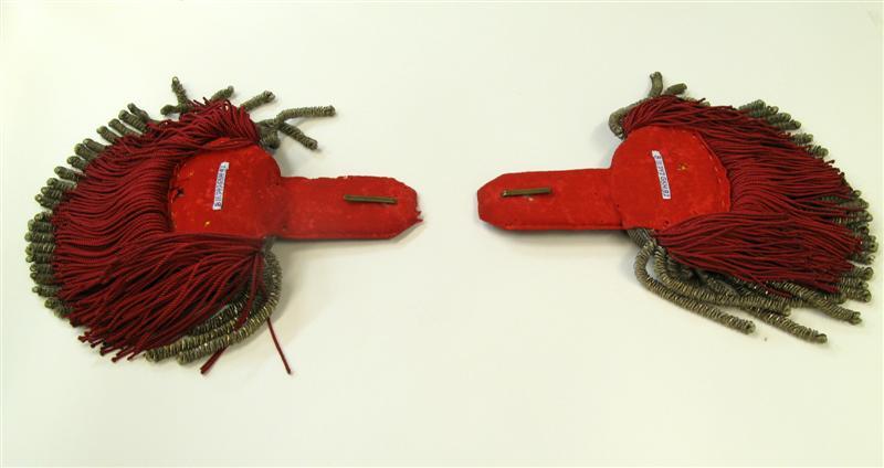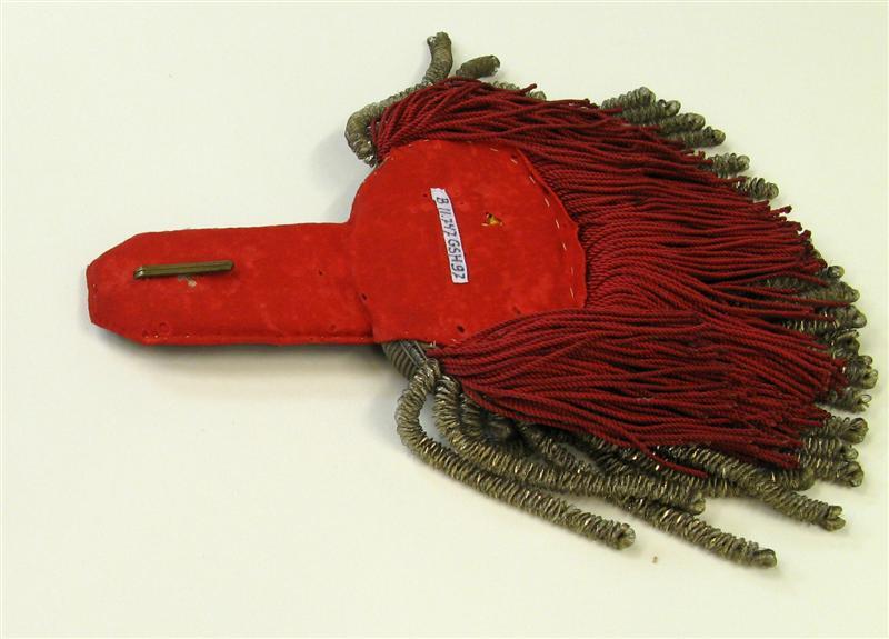 Model 23 mei 1860, voor tamboer-majoor. Epauletten zonder strepen in het zilverband, met dikke franje van zilverdraad en franje van rode zijde. Al het toegepaste metaaldraad is zilverkleurig. Op de bovenzijde een gebombeerde metalen knoop met stedekroon en randversiering. Op de onderzijde een koperen haak. Voering van rood laken. Behorend bij jas inv.nr. 11747.057.