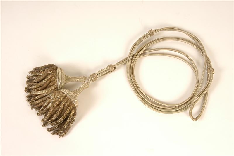 - BeschrijvingModel 24 oktober 1867, voor kapitein. Fouragère met 2 zilveren kwasten van bouillons, naast elkaar. De beide kwasten hebben een buitenring van 17 dikke en in het midden 2 dikke bouillons. Er is geen lus tussen de kwasten geknoopt. De overige gegevens zijn gelijk aan die van inv.nr. 11747.112.