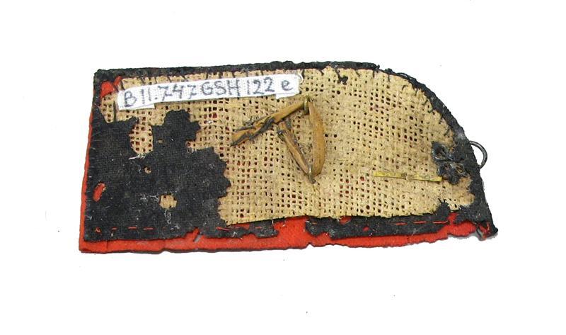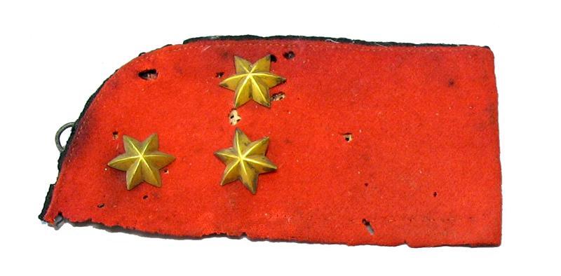 - BeschrijvingKapitein: 3 gouden sterren. Kraag: rood laken, gebiesd met donkerblauw laken. Voering: donkerblauw laken. Midden voor op de rand een zwart metalen oogje.