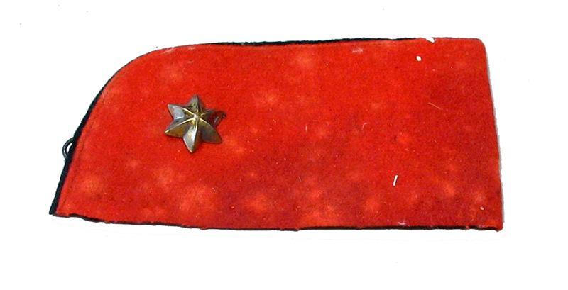 - Beschrijving2e luitenant: 1 gouden ster. Kraag: rood laken, gebiesd met donkerblauw laken. Voering: donkerblauw laken. Midden voor op de rand een zwart metalen oogje.