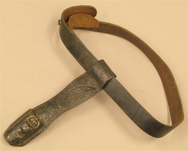 - BeschrijvingZwarte leren bajonetdrager (en niet -schede, zoals A.J.J. van de Well vermeldt in de hierna genoemde catalogus) met sierstiksel. Op de draaglus een zwartgelakt koperen gespje met riempje en lus.