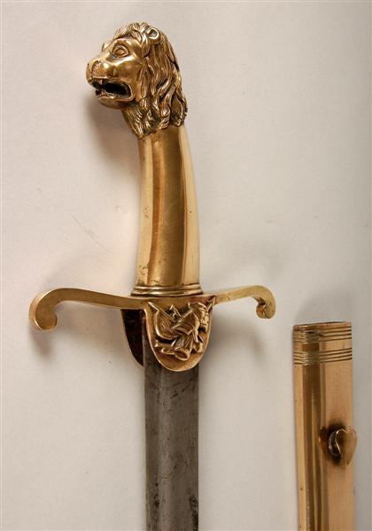 - BeschrijvingZwaard met koperen gevest en blanke kling. Greep met leeuwekop. Op de voorste zijvleugel is een koperen reliƫf aangebracht, voorstellend een trom, trompet, vaandel, helm (?)