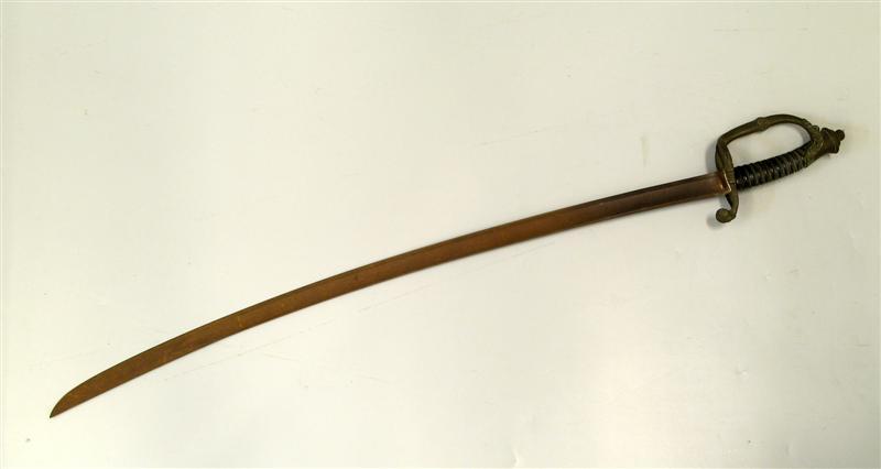 - BeschrijvingModel 1852, voor officier infanterie. Koperen, verzilverd gevest. Hoornen greep, omwonden met zilverdraad. Blanke, onbewerkte kling.
