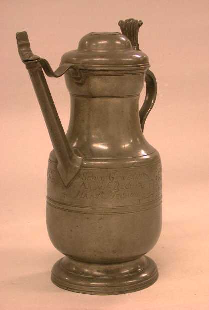 Kan met tuit. Gedateerd 1655 in de gravering. Noordduits. Medaillon op bodem. Tuit is voorzien van apart scharnierend dekseltje met duim, en is met een gegolfde strip tin nog bevestigd aan de kraag van de kan. Het dubbelkakige scharnier is bovenop handgreep gezet. Duim bestaat uit enkele voluten onder tegen het uiteinde van de handgreep is een wapenschildje gesoldeerd met het gegraveerde opschrift: "den 10 Juli 1889". Rond de buik van de kan is de volgende tekst gegraveerd ter weerszijden van een grote laars: B. Herr Arent Becher, Diderich Mechow, Hans Mechow, Iochim Klaeden 1655. In de bodem, binnenzijde van de kan, is een met bloemmotieven gedecoreerd medaillon gesoldeerd