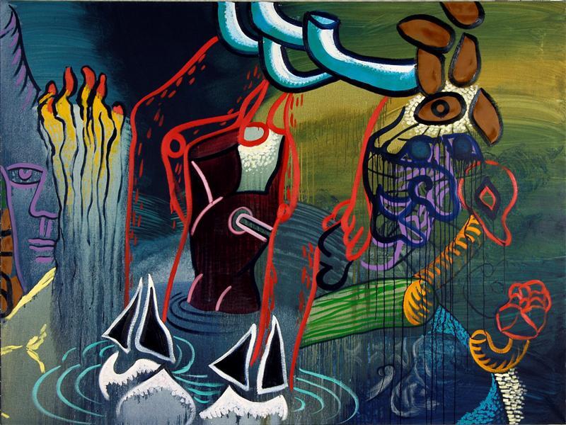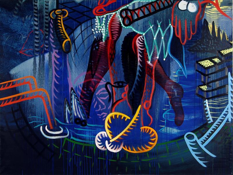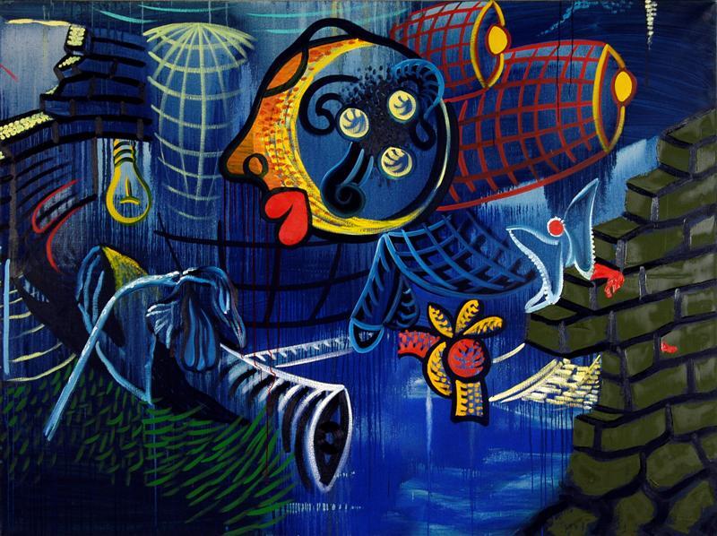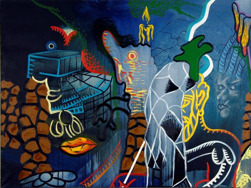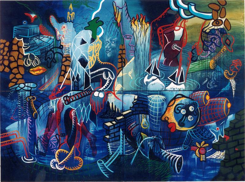 - BeschrijvingSchilderij samengesteld uit vier doeken met doorlopende voorstelling. De voorstelling, in overwegend blauwe tinten, bevat zowel abstracte als figuratieve elementen.