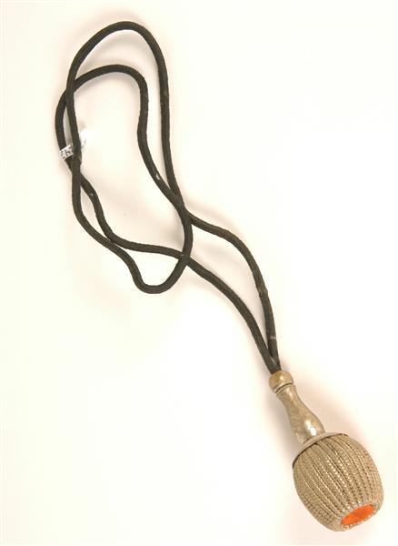 - BeschrijvingModel 1866, voor luitenant. Kwast van 32 zilveren torsades(dunne bouillons?) van oversponnen massief pletzilver, waartussen zilverdraad. Bodem van oranje zijden garen. Peer en 4 randjes van glad metaal. Zwart wollen gevlochten koord.