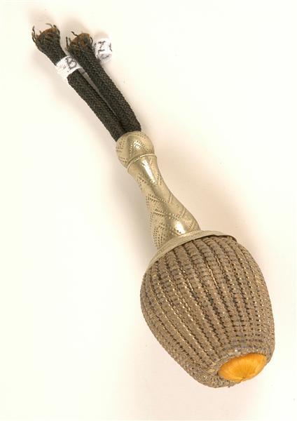 - BeschrijvingModel 1866, voor luitenant. Kwast van 32 zilveren torsades van oversponnen massief pletzilver, waartussen zilverdraad. Bodem van oranje zijden garen. Peer en 4 randjes van glad metaal. Zwart wollen gevlochten koord.