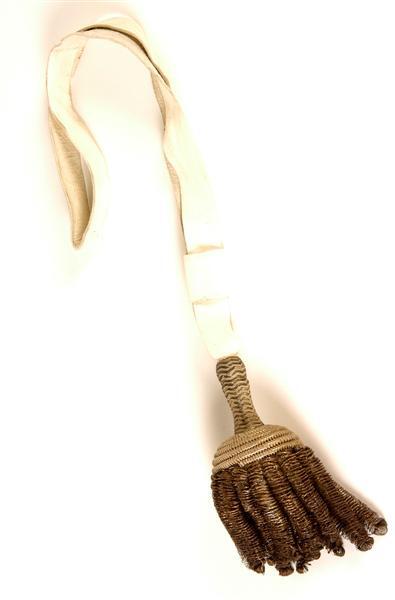 Kwast van 15 dikke en 10 dunne zilverbouillons. Peer overvlochten met 2 soorten zilverdraad. 6 randjes van bouillon oversponnen met massief pletzilver. Aan de kwast is een witte leren band met een witte leren schuiver bevestigd. De kwast is zeer waarschijnlijk afkomstig van een fouragère voor een hoofdofficier. De band is daar later aangezet (mogelijk in het museum). Vergelijk de band met de degendrager van inv.nr. 11747.155.
