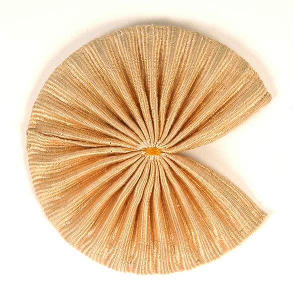 - BeschrijvingKokarde van oranje zijden lint. Ketting naturel linnen, inslag gedeeltelijk oranje zijde (voorkant) en gedeeltelijk naturel linnen. In het midden gerimpeld en bijeen gebonden met oranje garen. De punten van een zijnaad zijn aan elkaar gehecht, de andere zijnaad open. Achterzijde voorzien van een lijmlaag. Model 1828