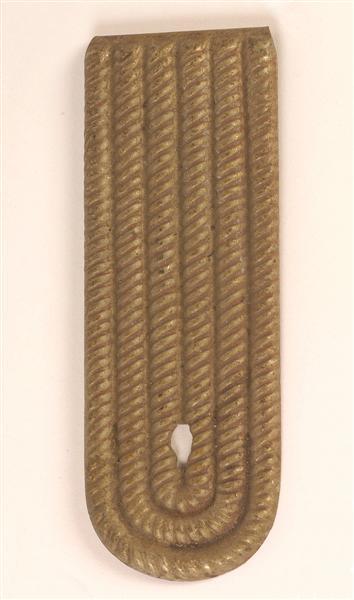 - BeschrijvingLis van blank metaal. Model 1854. Ingeslagen motief van 3, in een lus gelegde koorden. De bovenrand is naar achter omgeslagen. De omslag is naar beneden toe afgerond. Onderaan in het midden van de lis is een vertikaal sleufje geslagen. De lis is aan de onderkant afgerond.