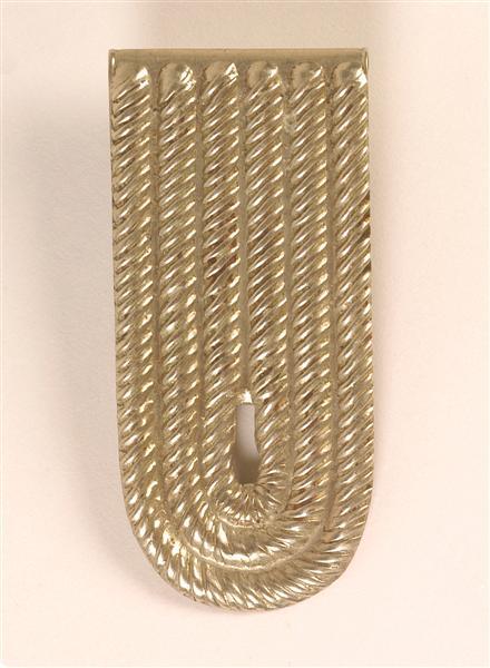 - BeschrijvingLis van vernikkeld metaal. Model 1868. Ingeslagen motief van 3, in een lus gelegde koorden. De bovenrand is naar achter omgeslagen. De omslag is naar beneden toe afgerond. Onderaan in het midden van de lis is een vertikaal sleufje geslagen. De lis is aan de onderkant afgerond. Ingeslagen randje langs de omslag