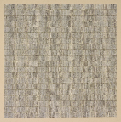 In kwadraten opgedeeld zwart vierkant, met tegengesteld ingeschilderde verticale witte, verkleurende lijntjes
