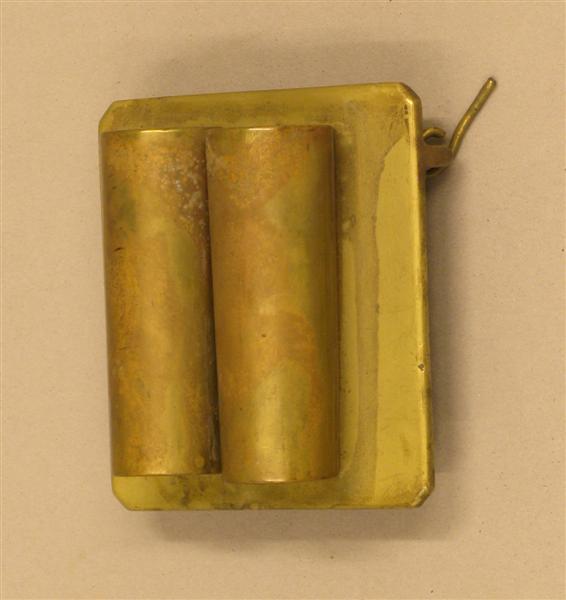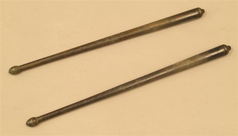 - BeschrijvingModel 1865. Koperen plaat (gesp) met op de achterkant een beugel met 2 tongen. Op de voorzijde 2 koperen kokers. In beide kokers een trommelstok van donkerbruin hout met 7 ingesneden ringen. Aan de bovenkant van de stokken is een spitstoelopende punt gedraaid.