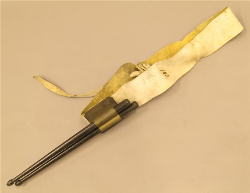 Model 1828. Witte leren drager, aan beide uiteinden rond afgesneden. Bestaat uit 2 aan elkaar genaaide repen leer en wordt gesloten met een smalle witte riem. Deze riem is aan een uiteinde geknoopt en door het gat van een rond leren plaatje gehaald. Op het midden van de riem is een reepje leer genaaid. In de riem 7 gaatjes. De riem wordt geschoven door een knoopsgat in het ene uiteinde van de draagriem en een gat in het andere uiteinde. Achter de bevestiging van de stokkenplaat bevinden zich 2 stukken zeemleer, samengebonden met een veter van hetzelfde materiaal. Koperen stokkenplaat, met touw op de achterkant van de drager bevestigd. Op de plaat 2 koperen kokers, waarin 2 donkerbruine stokken met 7 ingesneden ringen en bovenop een 'dopje'
