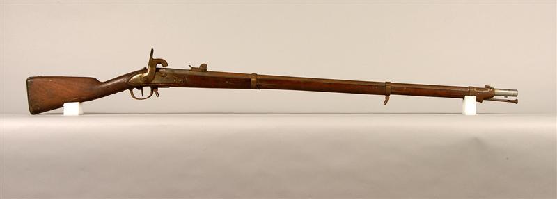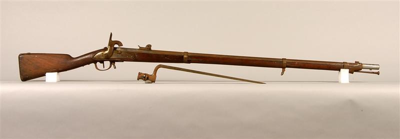 - BeschrijvingGeweer met bajonet nr. 21 en laadstok. Slot met 'pannetje' (omgebouwd vuursteengeweer?). Met witte leren geweerriem.