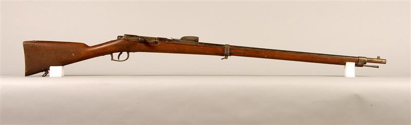 - BeschrijvingModel 1871, bouwjaar 1876, nr. L52. Met ontlaadstok nr. 52 en bajonet nr. L52.