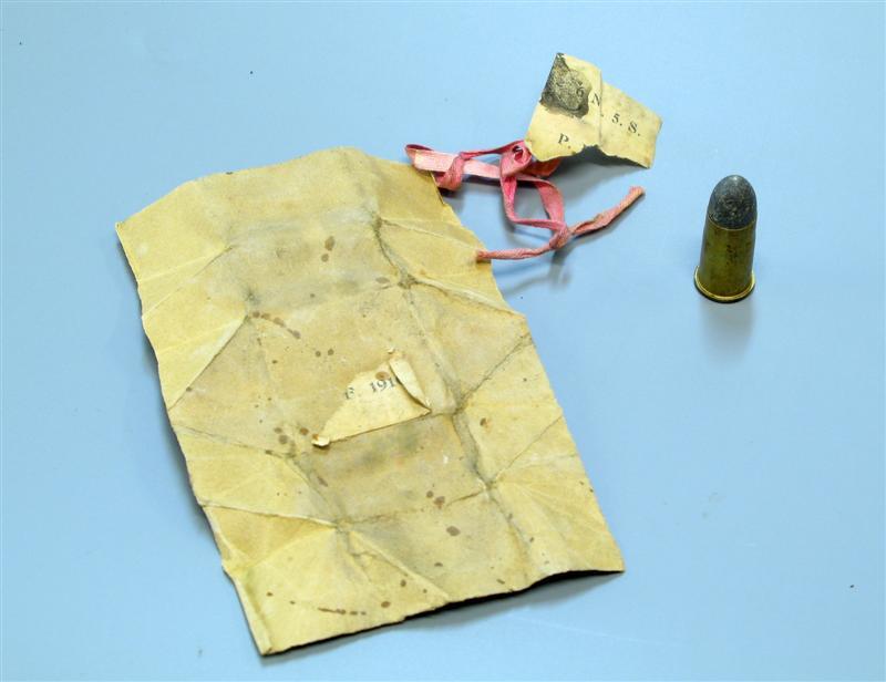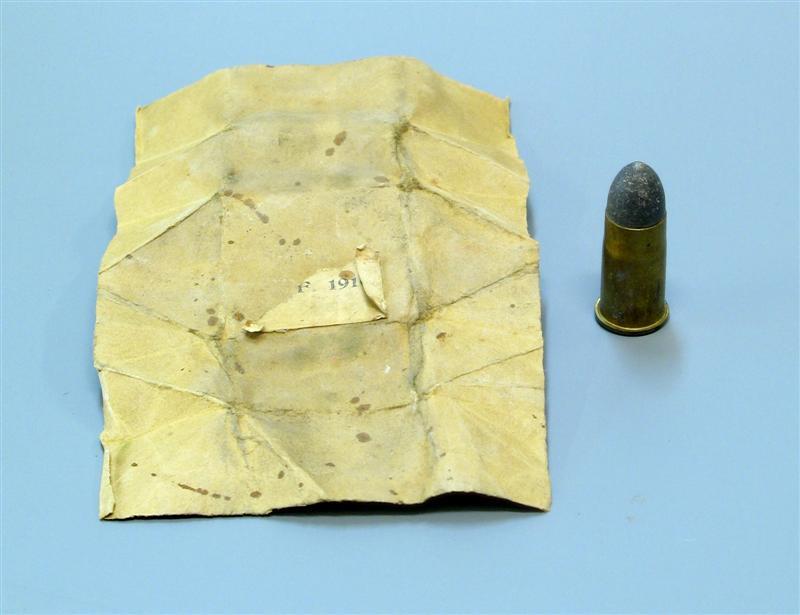- BeschrijvingModel 1873. Patronen in ecru papier met rose katoenen lintje. Kunnen gebruikt worden in (en behoren mogelijk bij) het officiersrevolver model 1873.