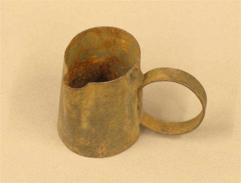 Behoort bij inv.nr. 11747.288.alg. Blikken maatje met schenktuit en oor. Papiertje binnenin op de bodem.