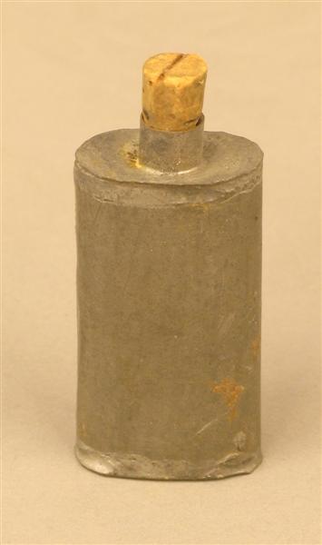 - BeschrijvingBlikken flesje, afgesloten met een kurk. In de onderkant van de kurk is een veertje gestoken.