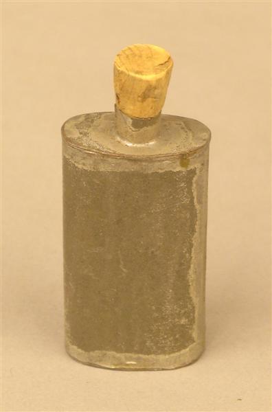 - BeschrijvingBlikken flesje, afgesloten met een kurk. In de onderkant van de kurk is een veertje gestoken.