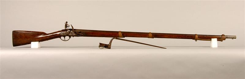 - BeschrijvingVuursteengeweer voor officier uit de bataafse republiek. Met schachtbajonet zonder stormring en laadstok. Roodkoperen banden, versierd met een vlaggentrofee. Geelkoperen beugel, kolfplaat en zijplaat ook versierd. Koperen plaatje op de greep omgeven door in hout gesneden krullen.