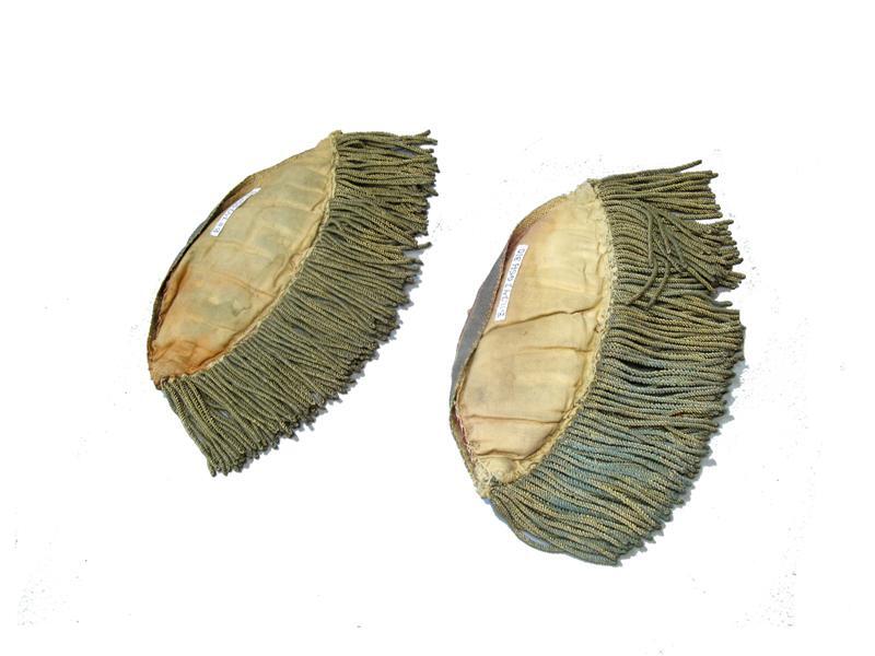 - BeschrijvingModel 17 oktober 1830, voor sergeant-tamboer (ook tamboer-majoor). Zwaluwnesten van rood laken, versierd met zilvergalon. Langs de onderkant een zilverkoord. Franje van (koperen?) goudkleurige torsade. Voering witte keper-katoen. Tussenvoering witte wol.