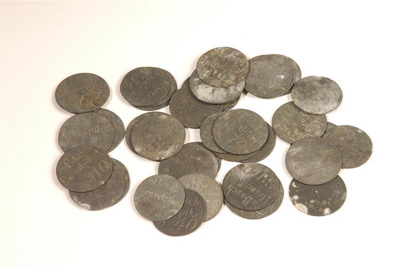 - Beschrijving37 ronde zinken presentiepenningen der leden van het Brandpiket der Bossche Schutterij Opschrift: "'s BOSCH BRANDPIKET Nr. ..". In iedere penning is een ander nummer geslagen. Aanwezig zijn de volgende nrs.: 7, 8, 10, 11, 17, 21, 25, 28, 29, 40, 44, 52, 54, 55, 57, 59, 60, 62, 63, 64, 71, 73, 79, 81, 86, 90, 92, 97, 99, 102, 104, 108, 110, 111, 112, 113, 119