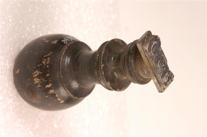 - BeschrijvingRubberen stempel met de tekst: "Geboekt".Het rubber is gelijmd op een rechthoekige metalen plaat. Gedraaid houten handvat. Zwart gelakt.