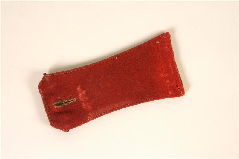 Schouderlap van rood laken, gevoerd met donkerblauw laken. Tussenvoering naturel jute. Knoopsgaten met de hand gefestonneerd. De lap is geheel met de hand genaaid. Onder beide afgeschuinde hoeken een zwart metalen haakje. Model: langwerpig. Een korte zijde is schuin afgesneden. De tegenover liggende zijde heeft afgeschuinde hoeken. De lange zijden zijn naar binnen gebogen.