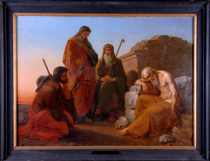 Job werd door Christus zwaar beproefd in zijn geloof. Hij werd van al zijn bezittingen beroofd, al zijn kinderen waren gestorven en zelf kwam hij onder de zweren te zitten. Ondanks dit alles volhardde hij in zijn geloof. Afgebeeld is het moment dat Job op een ashoop gezeten door drie vrienden werd bezocht. Zij hadden het voornemen hun vriend te komen troosten, maar zijn ellende in ogenschouw nemend konden zij de eerste zeven dagen en nachten geen woord uitbrengen. Daarna begon er een zeer lang dispuut (de hoofdstukken 3 t/m 42 van het boek Job) tussen Job en zijn vrienden over het probleem van het lijden in de wereld.